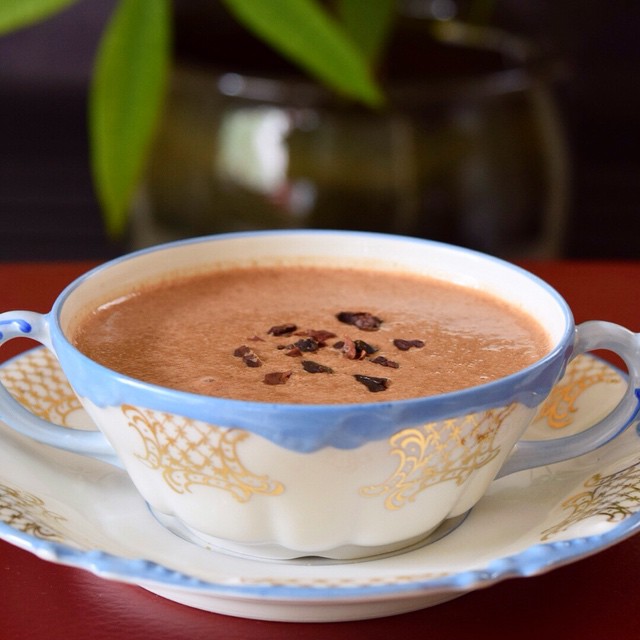 2 cups unsweetened almond milk, 1 Tbs raw cacao powder (not cocoa!), 1 tsp cacao nibs, 1 tsp chia seeds, 1 tsp maca powder, 1/2 tsp ashwagandha powdr, 2 large dates, 1 tsp vanilla extract.